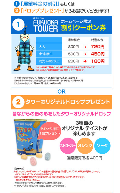 福岡タワーでは、ホームページをご覧の方限定で、展望料金が安くなったり、または「タワーオリジナルドロップ」がもらえたりする、 1割引のクーポン・優待券を発行しています。※ご注意:割引クーポンの情報は、2017年3月時点の情報です。