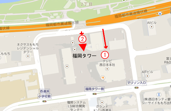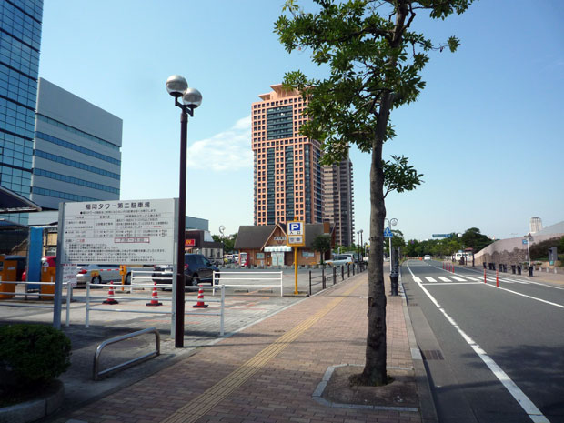 福岡タワー北側の道路より侵入して、福岡タワーの北側(裏面入口)の駐車場福岡タワーのすぐ横の路上になります。